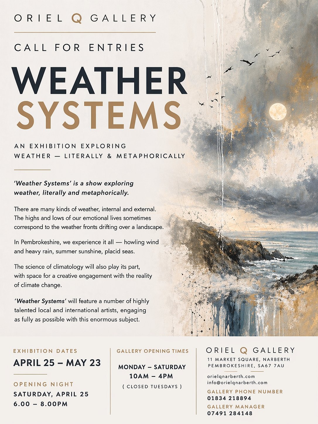 A show exploring weather, literally and metaphorically. We will be inviting artists from all kinds of media, from film to sculpture, to create visualisations on the theme in ways they feel the most appropriate. It could be said that there are many kinds of weather, internal and external, the highs and lows of our emotional lives sometimes corresponding to weather fronts drifting over a landscape. In Pembrokeshire, we often have the fullest experience of dramatic weather, howling wind and heavy rain, along with days of beautiful summer sunshine and placid seas. The science of climatology will also play its part, with space made for a creative engagement with the reality of climate change. ‘Weather System’ will engage as fully as possible with this enormous subject, and will feature a number of highly talented local and international artists. It runs from April 25 to May 23